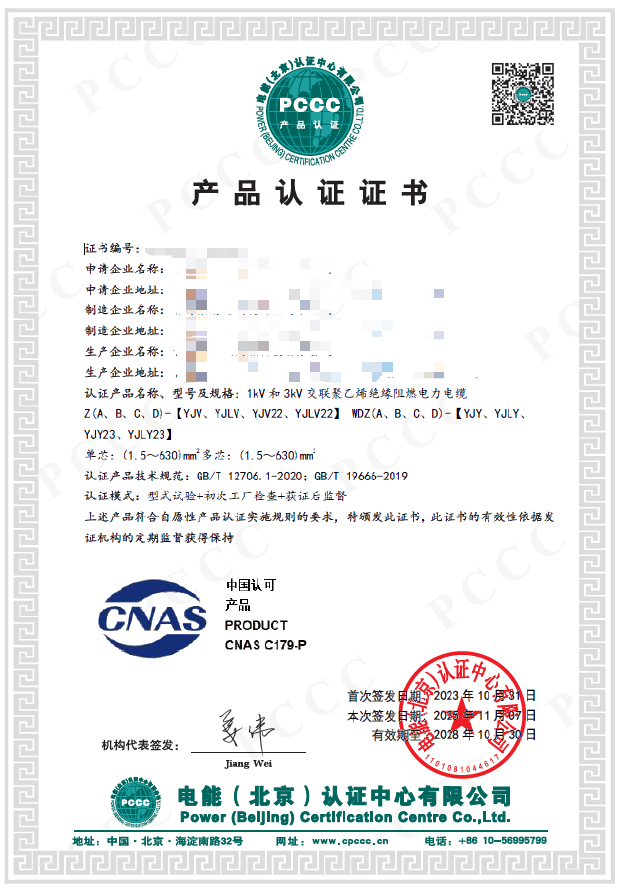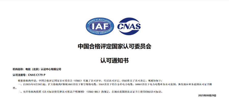 在扩项申报与评审阶段,专项工作组严格对标CNAS认可准则及电力行业最高质量标准,系统梳理原有认可能力体系,针对性完善电力电缆产品认证的技术规范、审核流程及全生命周期质量追溯机制,高效完成原有认可资格复评与10kV及以下架空绝缘电缆、35kV及以下铝合金芯电力电缆、500kV及以下电力电缆的扩项申请。面对CNAS专家组的严苛评审,工作组凭借扎实的技术积累、规范的管理体系与专业的服务能力,顺利通过文件评审、办公室评审及认证现场见证评审等多轮严苛考核,2025年9月,正式斩获CNAS认可决定书,实现电力电缆领域认可能力的跨越式升级。