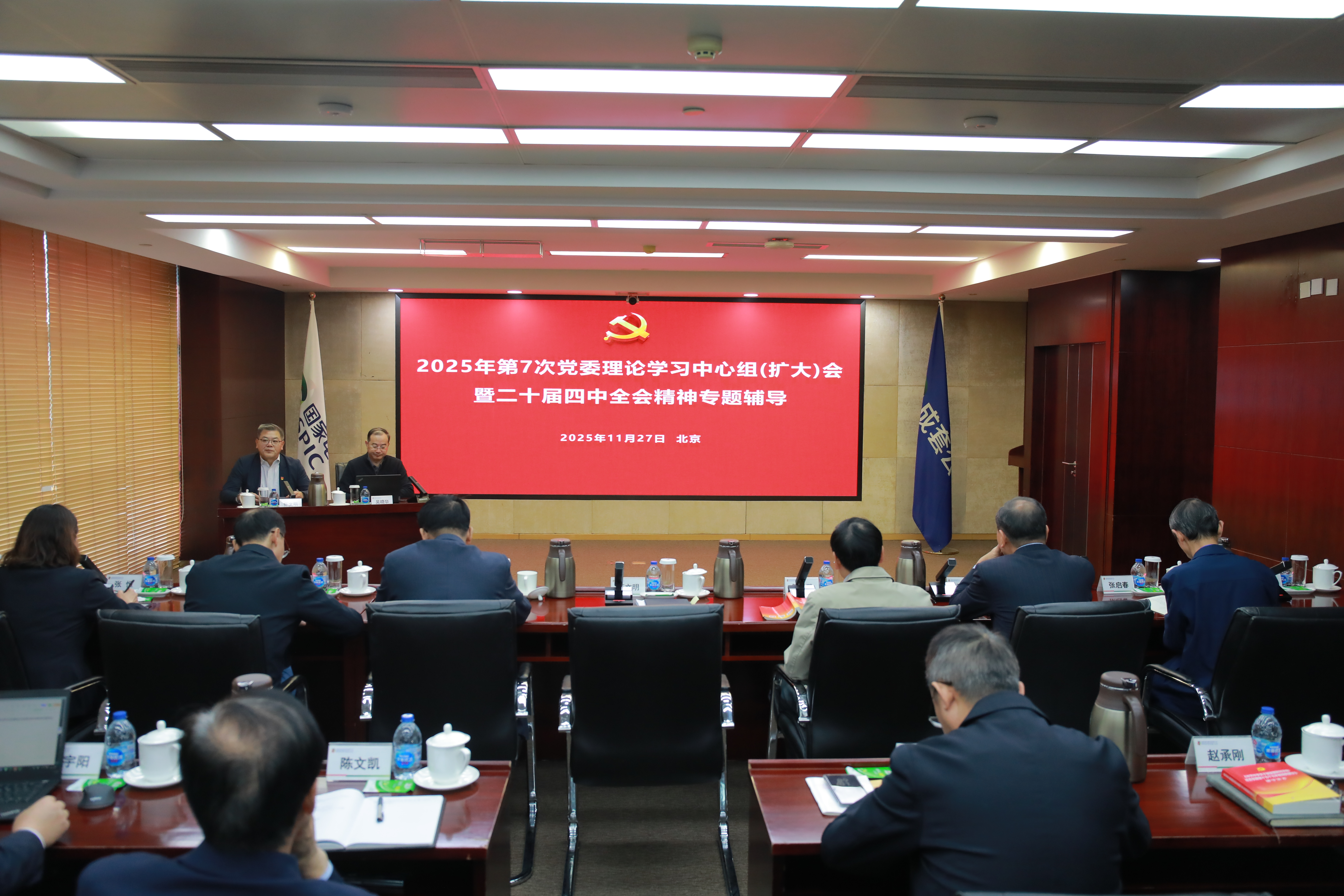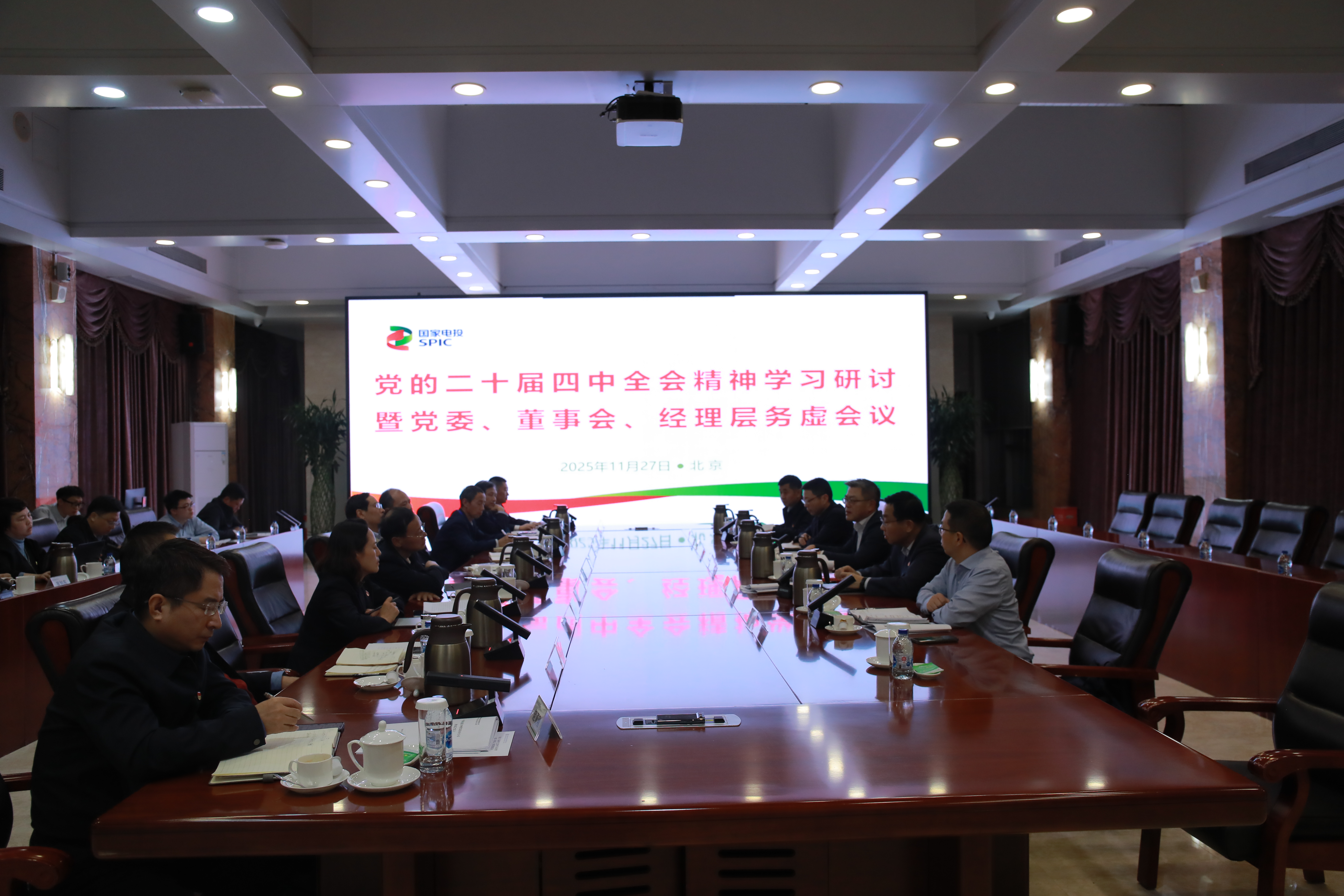 2025年11月27日,中国电能召开2025年第七次党委理论学习中心组学习研讨(扩大)会暨党委、董事会、经理层务虚会议。会议集中开展党的二十届四中全会精神专题辅导,深入学习全会的主要内容和精神实质;深入分析面临的形势和下一步重点工作,进一步聚焦中国电能主责主业和专业化能力提升方面开展研讨。公司董事长、党委书记怀文明主持会议,董事、总经理、党委副书记胡亚民,董事张树林、魏青峰、赵伟及公司领导何玮鹏、沈小龙、杨启斌、张恒、张启春出席会议。